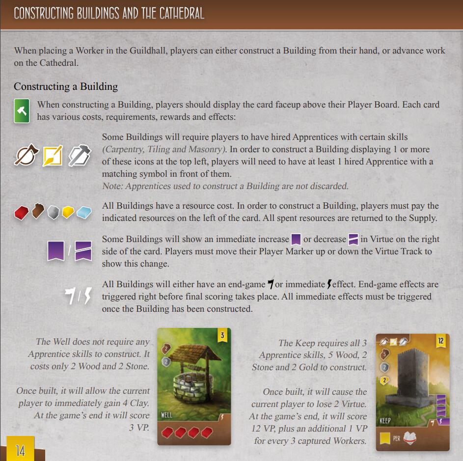 The aim of Architects of the West Kingdom is to be the player with the most victory points (VP) at game's end. Points are gained by constructing various buildings and advancing work on the Archbishop's cathedral. Throughout the game, players need to make a lot of moral decisions. However, only at game's end will their virtue be judged. A few underhanded deals here and there might not seem like much, but fall too far and you will be punished. The game ends once a set number of constructions have been completed.