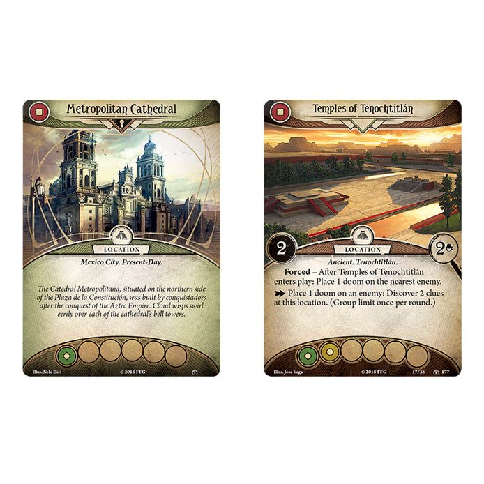 The fabric of time unravels in The Boundary Beyond, the second Mythos Pack in "The Forgotten Age Cycle" for Arkham Horror: The Card Game! Your investigation into a strange relic has led you to Mexico City, but when the architecture starts to shift into something out of a history book, your focus turns from investigation to survival. Step beyond the boundary and restore the timeline before it's too late!