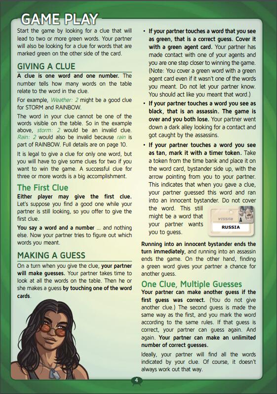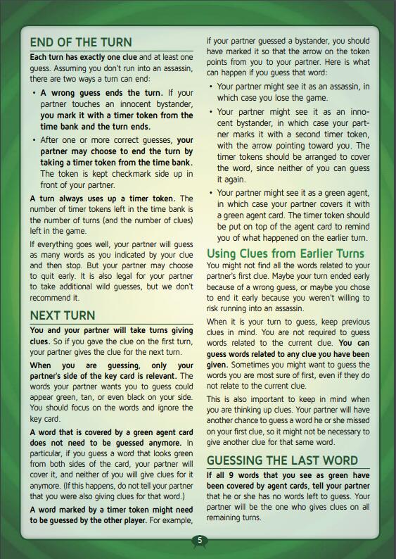 You’ll take turns giving one-word clues paired with a number, pointing the operative(s) across from you to specific words on the grid. Guess right? Keep going. Guess a bystander? Your turn ends. Guess an assassin? Mission failed — game over. But as long as your guesses are correct, you can keep going, even revisiting past clues.