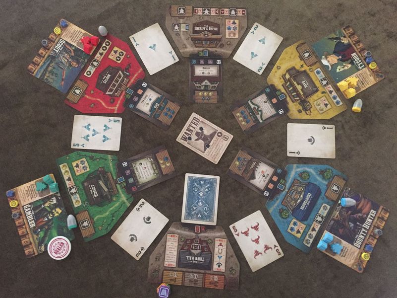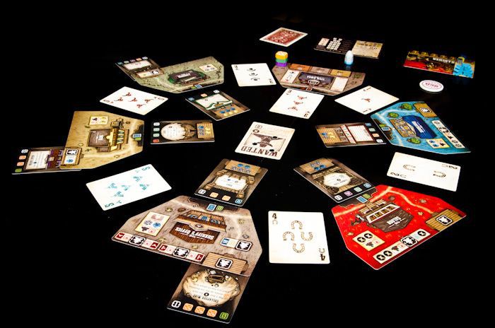 GAMEPLAY: The game is played in a series of rounds. Each round, poker cards are dealt between the locations, which are laid out in a circle. Players place posse members on these location cards, which will both give an action and count as a bid for the location's valuable resources. Players also get a poker card of their own which uses the two adjacent cards from a location to form a three-card hand. This creates a clever mix of modern worker placement and poker that drives the game. In addition, players must manage their resources of Law, Money and Force to buy buildings and gunfight. If you have the highest stake in the most lucrative industry at the end, you will be rewarded bonus points. Add these points to the points you've collected from buying buildings and determine the winner! Yippie kay yay a!