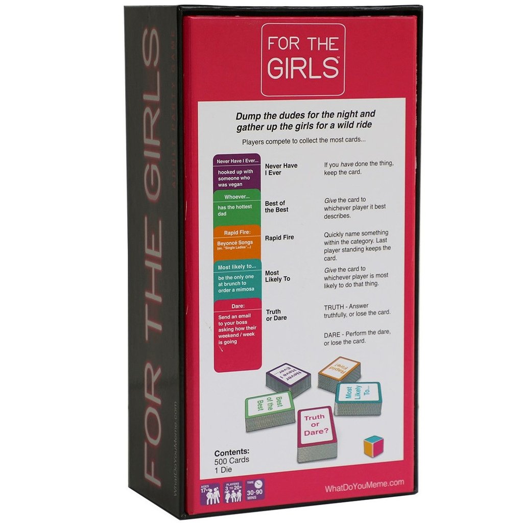 Hey girl hey. Welcome to a brand new party game from the creators of What Do You Meme? Ditch the dudes for the night because this game is For The Girls! Perfect for: Bachelorette Parties, Girls' Night In, Girls' Night Out, Birthday Parties, Sororities, Pre-games, Reunions, and more! Get prepared for rounds of Truth or Dare, Never Have I Ever, Most Likely To, Best Of The Best, and Rapid Fire!- The new "GIRLS-ONLY" adult party game by the creators of What Do You Meme?
