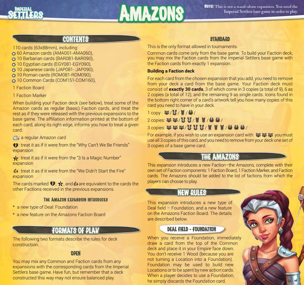 Warrior-tribe of Amazons, third big faction expansion, enters the world of Imperial Settlers! Discover the new deckbuilding mechanism, which lets you choose which of your faction cards you keep and focus on powerful combos!