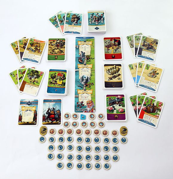 Imperial Settlers: Atlanteans, an expansion that requires the base game to play, adds the option for playing Imperial Settlers with up to five players. The expansion includes a new faction board, the Atlanteans faction deck, technology tokens, and expansion cards for the original factions that complement the Atlanteans abilities.