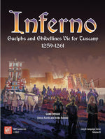 Inferno—the third volume in Volko Ruhnke's Levy & Campaign Series—fires up the cauldron 13th-Century Tuscan warfare, factional conflict fueled by the gold florins and teeming populations of up-and-coming cities and well-to-do valleys. Expert Italian wargame designer Enrico Acerbi brings the age to life within Volko's accessible medieval-operation system. Gathering transport and provender may not be as much the challenge here as the sudden treachery of rebel towns and castles along key roads. Italy's plundering berrovieri horsemen, famed elite crossbowmen, and distinctive palvesari shield bearers are just a few of the unique inhabitants of this volume. Muster, mount up, and find out whose blood will make the Arbia run red!
