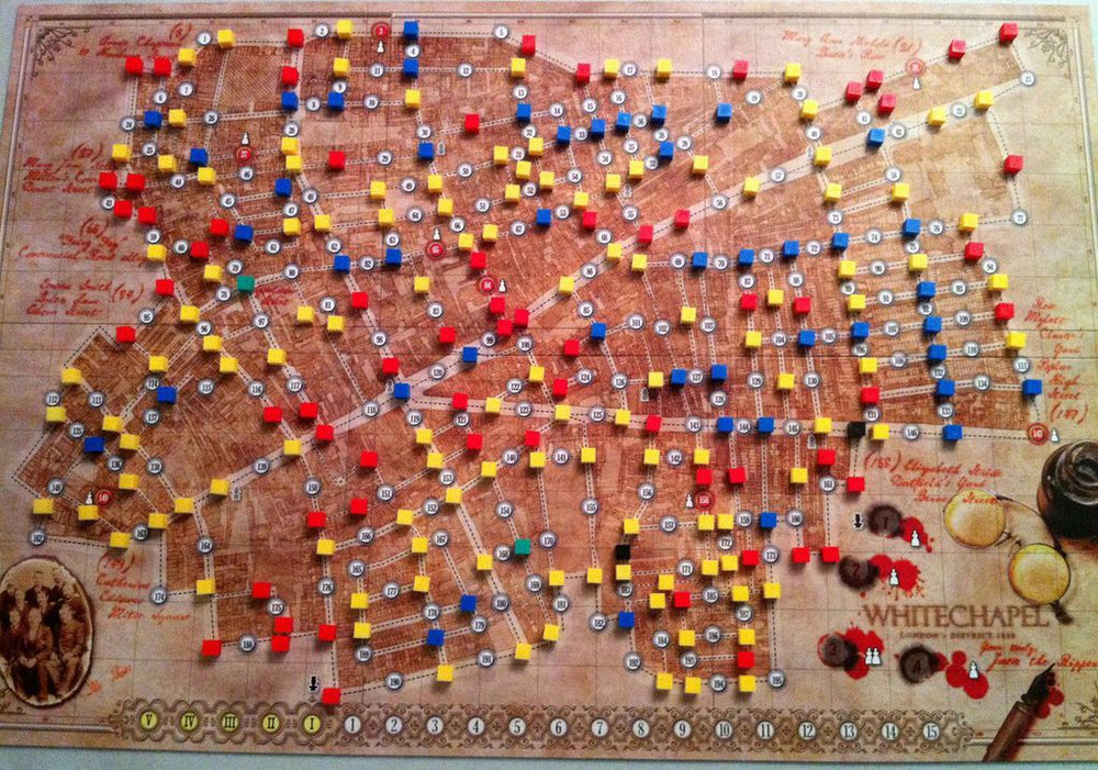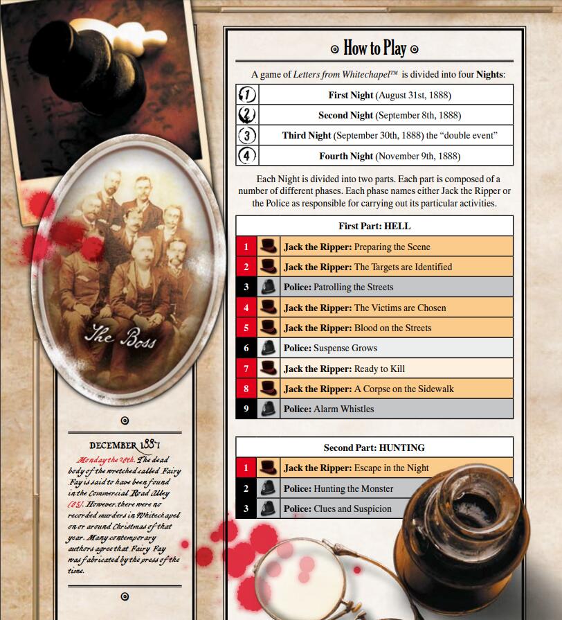 Welcome to Whitechapel. Welcome to Jack the Ripper’s streets. Letters from WhitechapelTM is a game of deduction and bluffing set in London, 1888, the time of Jack the Ripper. It’s a game for two to six players, age 13 or older, for an average time of 90 minutes. Five important detectives are on the trail of Jack the Ripper, the most dangerous serial killer of all time. They must chase the mysterious murderer through the tangled streets and alleys of the Whitechapel district. One player plays Jack the Ripper, and his goal is to take five victims before being caught. The rest of the players are police detectives, who must cooperate to catch Jack the Ripper before the end of the game.