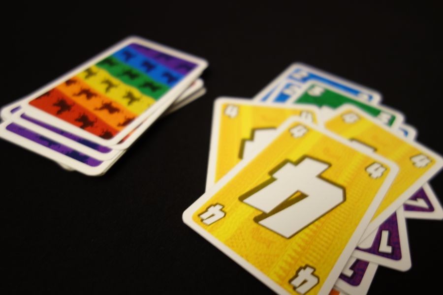 Each player starts a round with six cards in hand; the deck consists of llama cards and cards numbered 1-6, with eight copies of each. On a turn, the active player can play a card, draw a card, or quit. To play a card, you must play the same number as the top card of the discard pile or one number higher. If a 6 is on the discard pile, you can play a 6 or a llama, and if a llama is on top, you can play another llama or a 1. If you quit, you place your remaining cards face down and take no further actions in the round.
