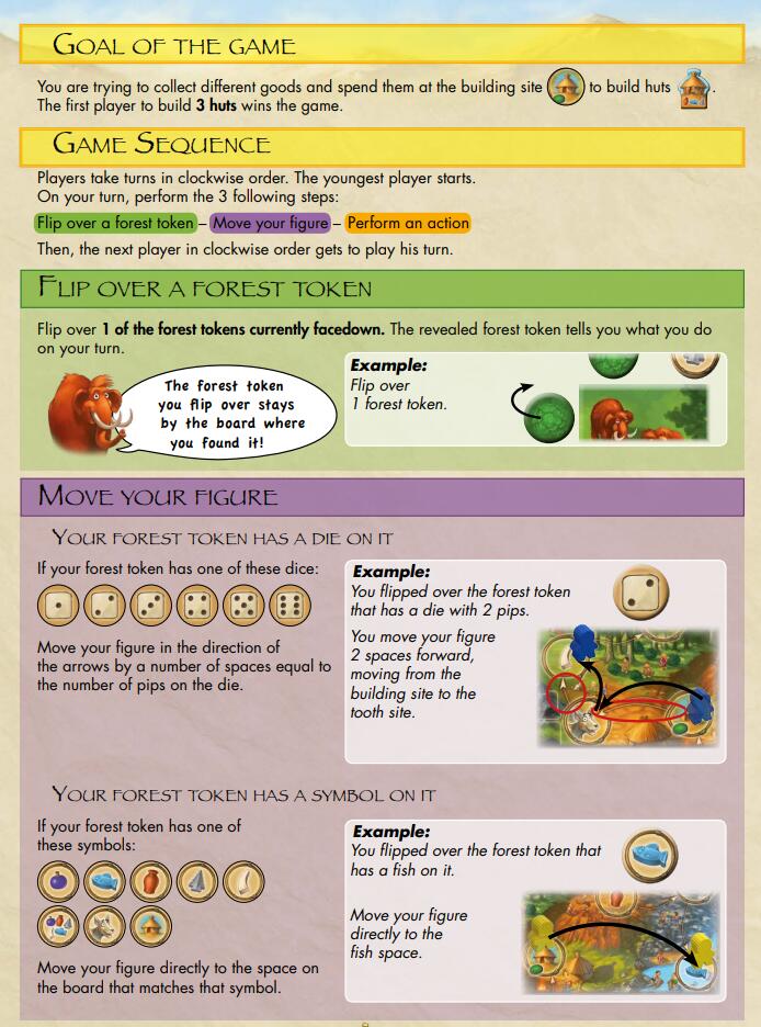 My First Stone Age is based on the classic family game Stone Age. This stand-alone game combines elements of memory, resource gathering, and set collecting games into an experience accessible to players age five and up. Players take actions based on the forest tokens they flip over each turn. But as soon as a hut is built, you flip those tokens back over and swap two of them. Pay careful attention and put your memory to the test as you search for the tokens that will lead you to the best resources. Enter the world of the Stone Age, develop your village, and let your imagination take you back to a time of wonder and fun!