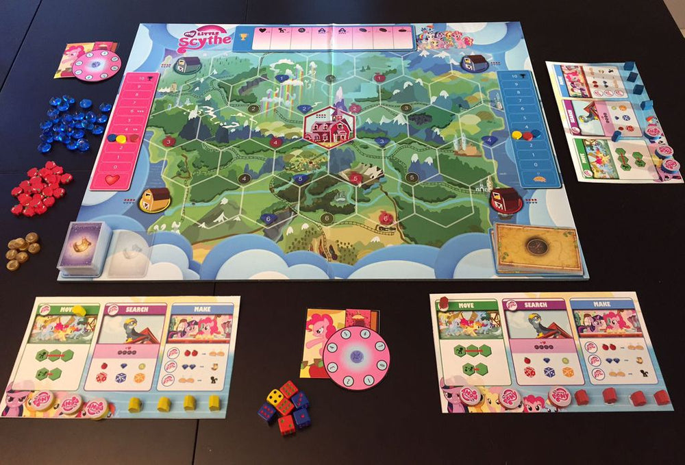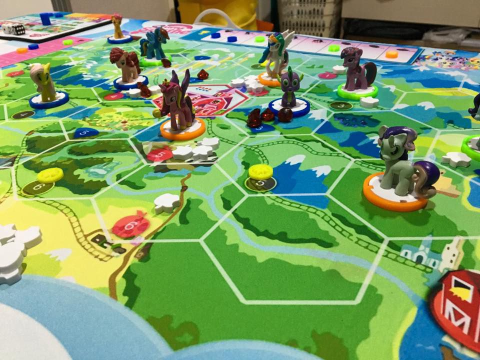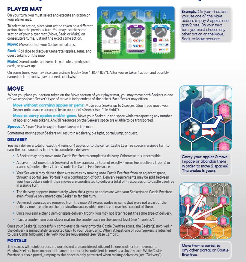 In an effort to be the first to earn 4 trophies from 8 possible categories, players take turns choosing to Move, Seek, or Make. These actions will allow players to increase their friendship and pies, power up their actions using upgrade tiles, complete quests, learn magic spells, discover precious resources through an innovative dice mechanism, deliver gems and apples to Castle Everfree, and perhaps even engage in a pie fight.