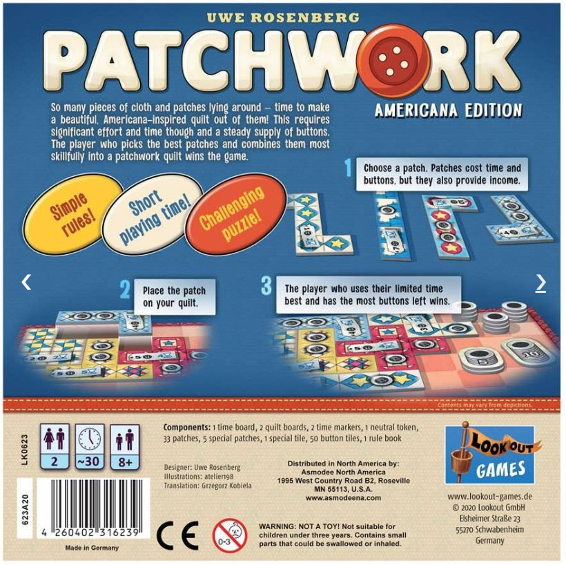 Patchwork Americana is the new edition of the highly acclaimed game by renowned designer Uwe Rosenberg. The original Patchwork is one of Lookout’s biggest hits, and this Americana Edition brings the same great two-player fun in an all new style. Patchwork Americana introduces new art and components inspired by the quilting communities of the United States. In the game, each player works to create a beautiful, Americana-inspired patchwork quilt out of the available patches by placing them on their 9x9 game board, looking to avoid leaving any empty spaces. The most beautiful quilt wins!