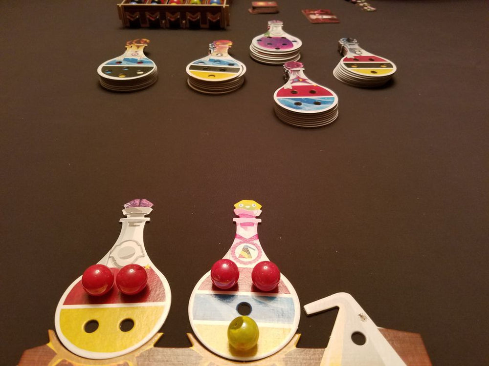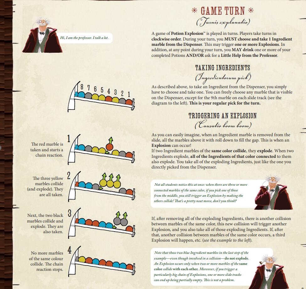 It's senior year at the Horribilorum Sorcery Academy for Witty Witches and Wizards, and all of your hard work and studying comes down to this: the final exams! In Potion Explosion, players collect ingredients from the unique slide dispenser to complete the potions they're working on. They must choose carefully as they pull out supplies such as Dragon Smoke and Fairy Dandruff. Players may even be able to cause ingredients to collide together and set off a chain reaction, allowing them to grab huge numbers of ingredients on a single turn. This will be critical in the completion of potions like The Elixir of Blind Love or The Balm of Uttermost Stickiness. It will require all of the magical craftiness that the players possess to graduate head of the class!
