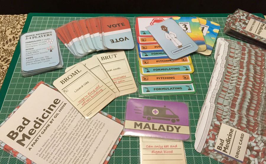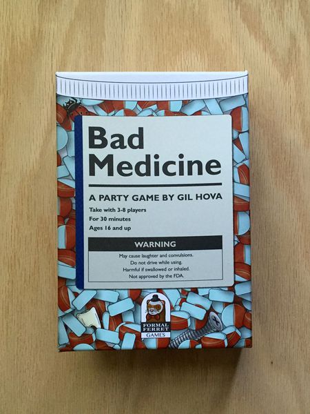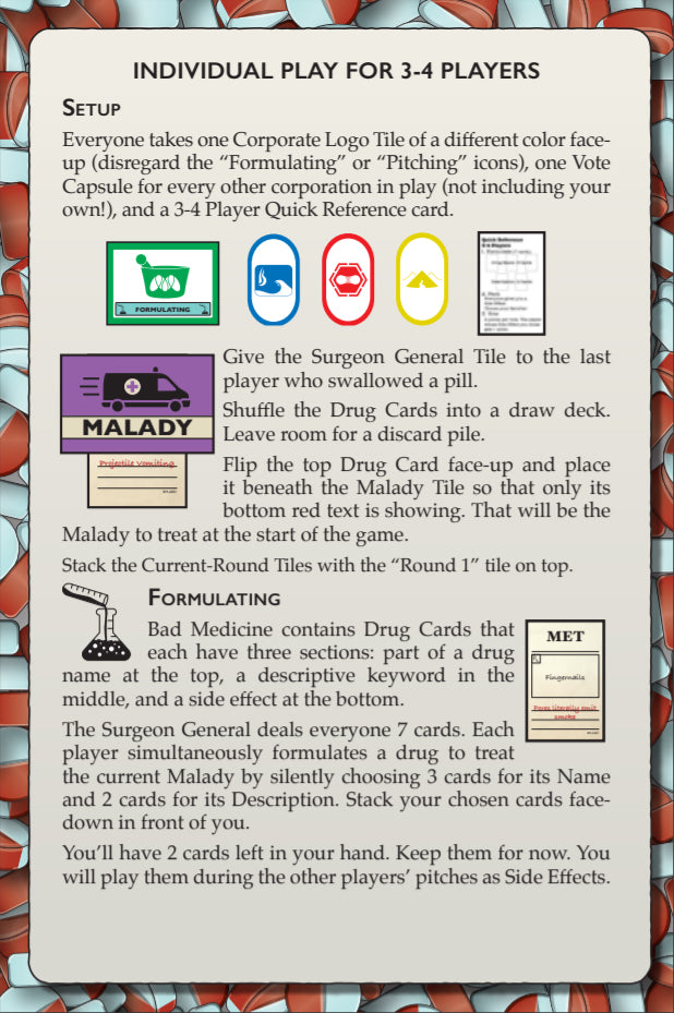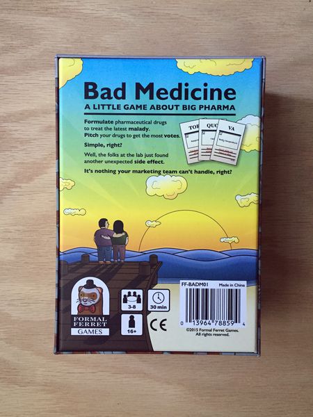 In Bad Medicine, you and your opponents are huge pharmaceutical companies. Your goal is to create names and advertisements for new drugs to cure the current Malady, while downplaying any side effects the folks at the lab may have discovered.