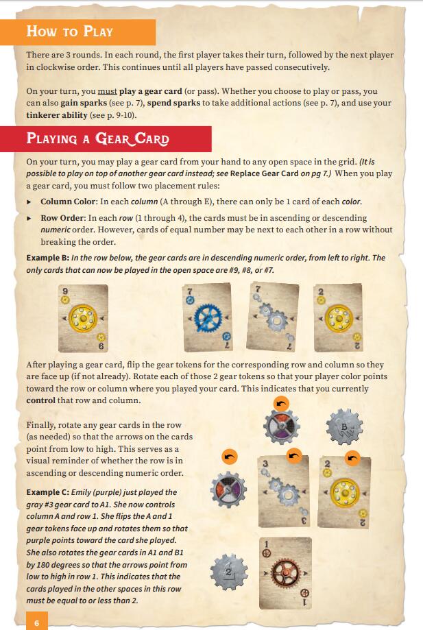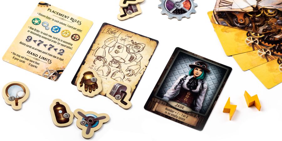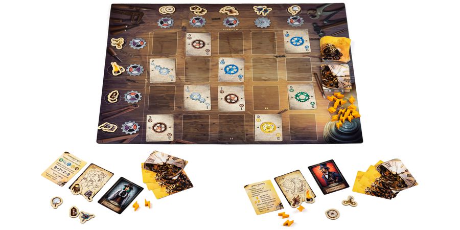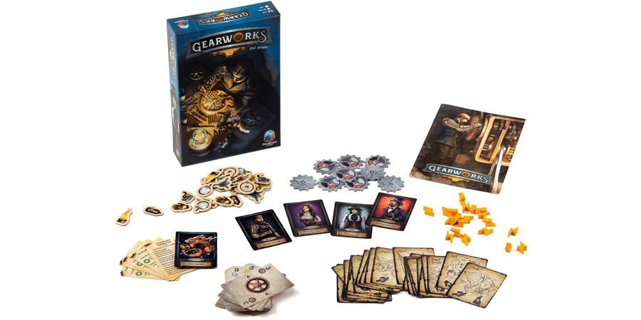 Gearworks is a steampunk strategy board game featuring card placement, hand management, and a "twist" on area control. Strategically position your gears to fix a mysterious clockwork machine in the corner of the workshop. Collect parts created by the machine each round by being the last player to fix its various components. As a tinkerer, you can certainly put those parts to good use and create fantastical contraptions!