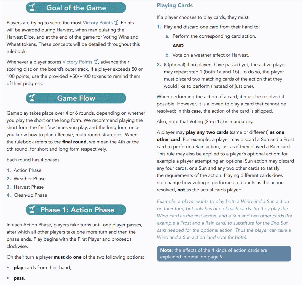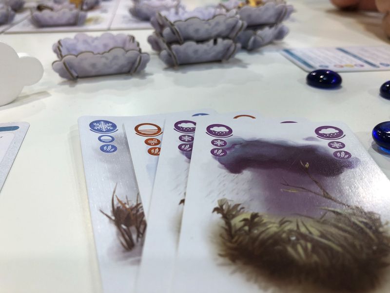 Petrichor is a highly interactive board game, playable by 1-4 people (up to 5 with the expansion, see below). It’s an action selection/area influence game, with 4 simple actions which interact with the various fields in ever surprising ways. The players move clouds with water droplets, and then rain those droplets onto specific fields, to make sure they have the right amount of water for the Harvest. During a Harvest, crops that have been watered enough are scored! Players are able to influence when, and how often the harvest happens. Players need to strike a fine balance between maintaining control of the different fields as well as influencing Harvest, to make sure the two come together at the optimal time.