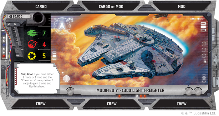 While the path to victory may be different for scoundrels finding their way in the Outer Rim, everyone starts from the bottom with a simple starship. Your player board not only tracks your fame progress, but also contains slots for your ship, your character card, gear, reputation, modifications, jobs, and bounties.