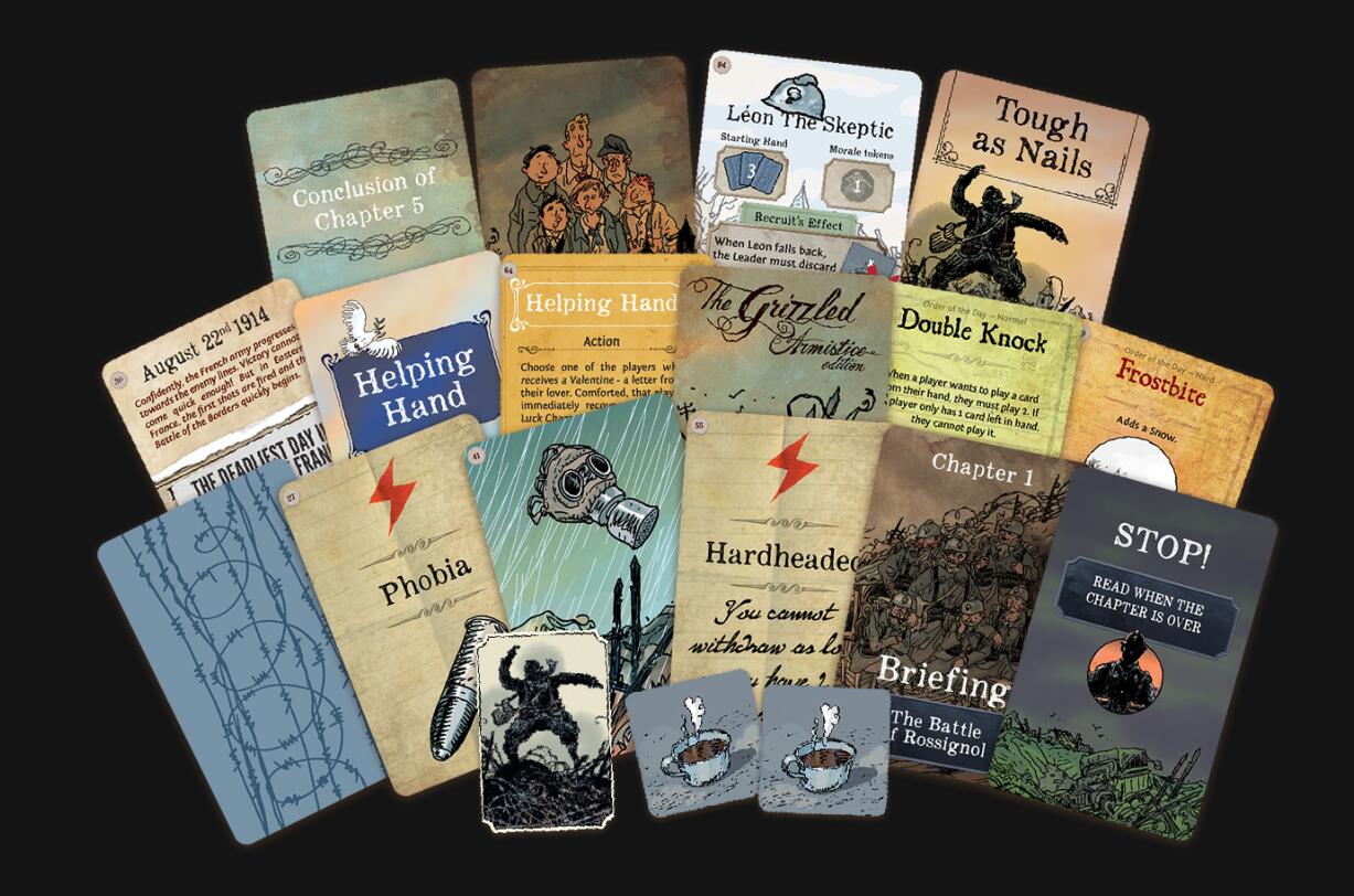 In The Grizzled: Armistice Edition, players take on the role of soldiers facing the Trials and Hard Knocks of the first World War. They work cooperatively across a campaign where they confront the major events of the war. From the introduction scenario of Boot Camp, through the nine different Missions, everything that happens carries forward and affects the next steps of the game. Players will need to make good decisions and support each other if they hope to make it to the end of the war alive.