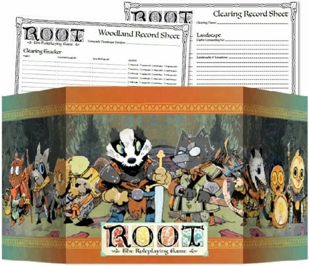 This Root: The RPG GM accessory pack includes a trifold GM screen featuring tools, tables, and information for run- ning the game, alongside two custom notepads for tacking your campaign!