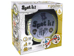Each card in Dobble features eight different symbols, with the symbols varying in size from one card to the next. Any two cards have exactly one symbol in common. For the basic Spot it! game, reveal one card, then another.