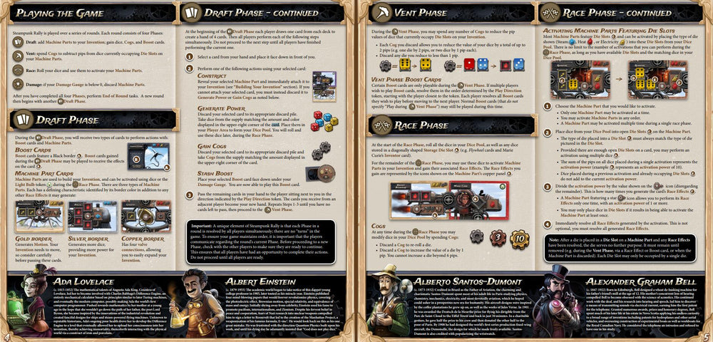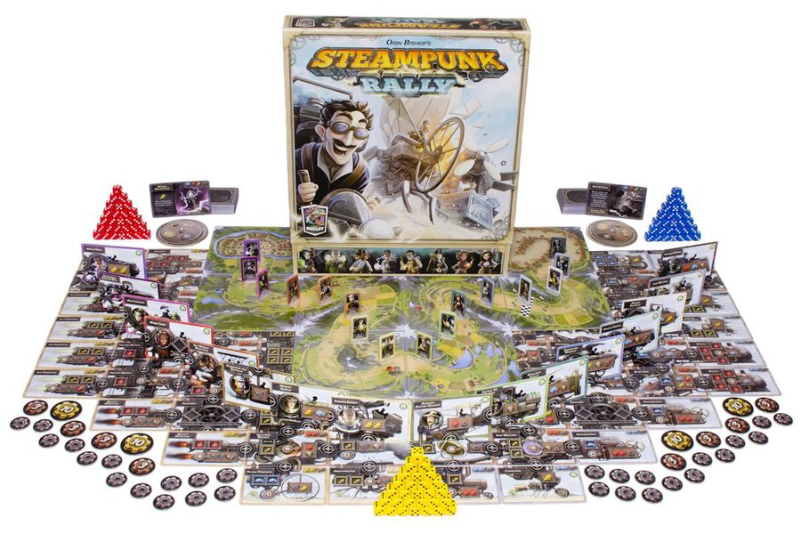 Steampunk Rally is a strategy game that incorporates steampunk as more than just a bit of chrome. Using a unique dice-placement mechanism, players take on the roles of famous inventors from the turn of the last century like Nikola Tesla and Marie Curie, constructing fantastical contraptions that make use of steam, heat and electricity in an attempt to win a no-holds-barred race through the Swiss alps.