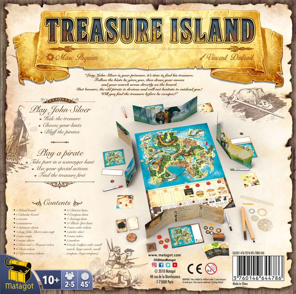 Treasure Island is a game of bluffing and adventure in which one player embodies Long John, trying to mislead the others in their search for his treasure.